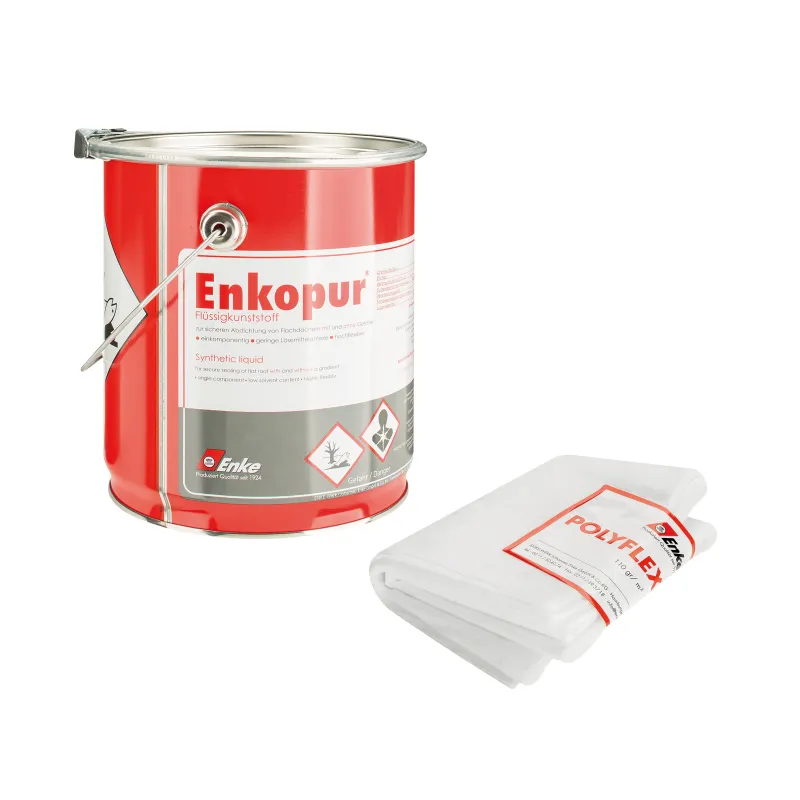 Enkopur je jednosložková polyuretanová vrstva na bázi osvědčených PUR – prepolymery, která je odolná proti povětrnostním vlivům. Chemické složení je na bázi tekuté polyuretanové pryskyřice. Polyesterová rohož Enke-Polyflexvlies je termicky vázaná rohož o hmotnosti 110g / m² bílé barvy. Velmi dobrá nasákavost a schopnost přizpůsobit se nerovnosti podloží.