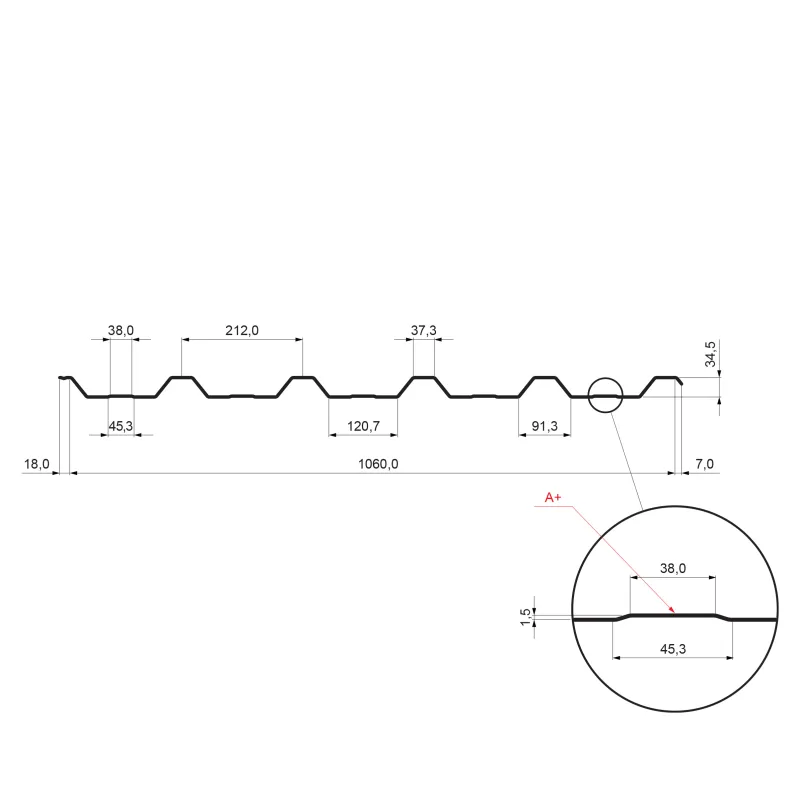 Profil TR 35A+ je určen na střešní plochu s minimálním sklonem 8° bez příčného spoje a 10° s příčným spojem, s přesahem min. 200 mm. Prolis je určen na zvýšení nosnosti a zlepšuje vizuální stránku trapézu.